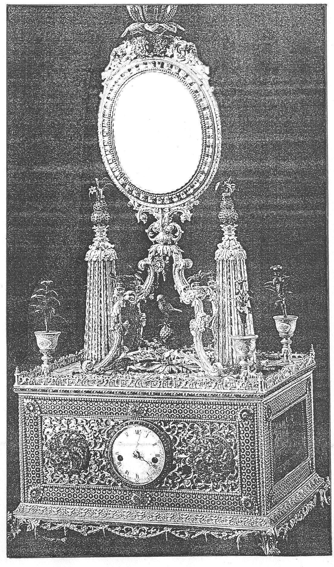 Ил.248. Часы-кашпо настольные с зеркалом и изображениями фонтанов и фейерверков. Бронза, стекло, расписная эмаль, стразы, литье, гравировка, золочение, инкрустация. Мастерские Кантона/Гуанчжоу, период Цяньлун. Музей Гугун, Пекин [164, с. 79].