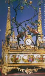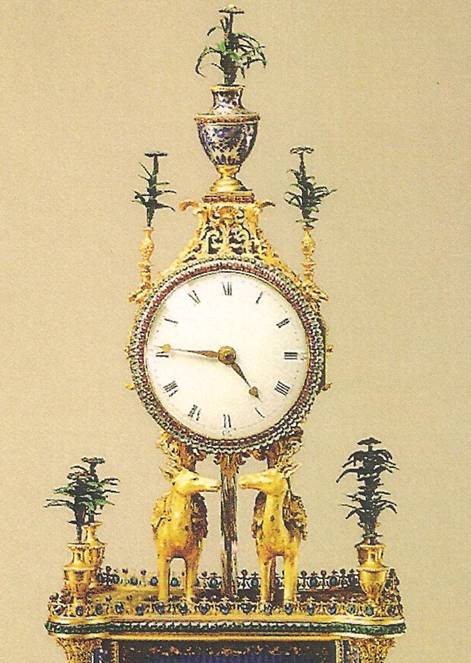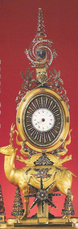 Ил.259. Фрагмент декоративной оправы часов в виде лани, поддерживающей колесо-циферблат. Бронза, стекло, эмаль, ограненные камни и стразы, литье, гравировка, золочение, инкрустация. Мастер У. Карпентер. Англия, 1770 – 1780-е гг. Музей Гугун, Пекин [164, с. 151].
