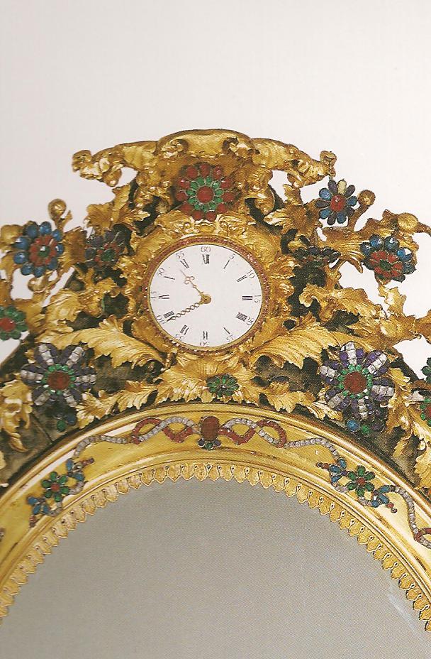 Ил.252. Часы-зеркало (с фрагментом оправы) в виде цветочного венка. Бронза, стекло, стразы, эмаль, литье, чеканка, гравировка, золочение, инкрустация. Мастерские Кантона/Гуанчжоу, период Цяньлун. Музей Гугун, Пекин [164, с. 77].