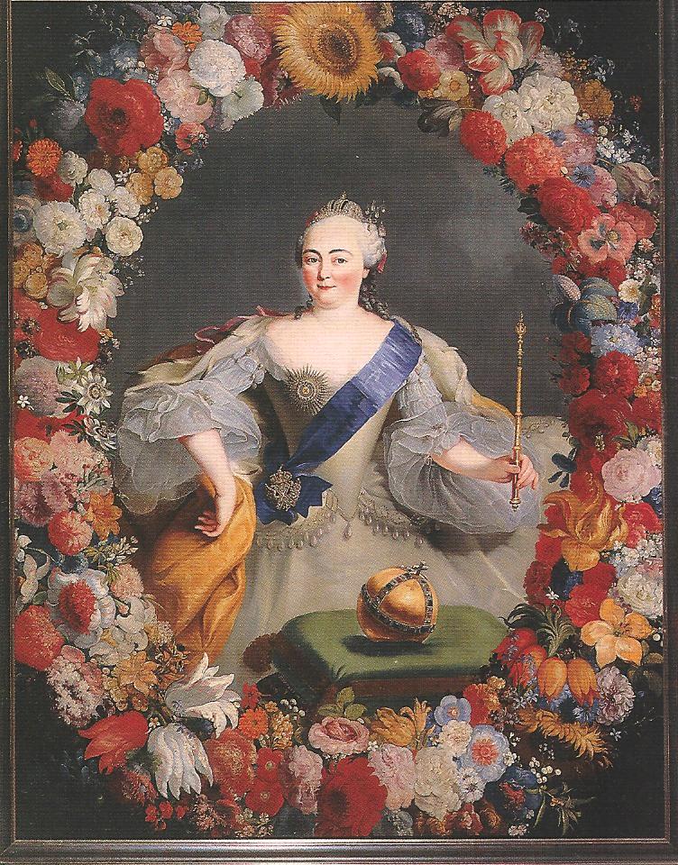 Ил.254. Г.-К. Пренер. Портрет российской императрицы Елизаветы Петровны в раме из цветочного венка. Холст, живопись масляными красками, первая половина XVIII в. ГТГ, Москва [146, № 115 ].