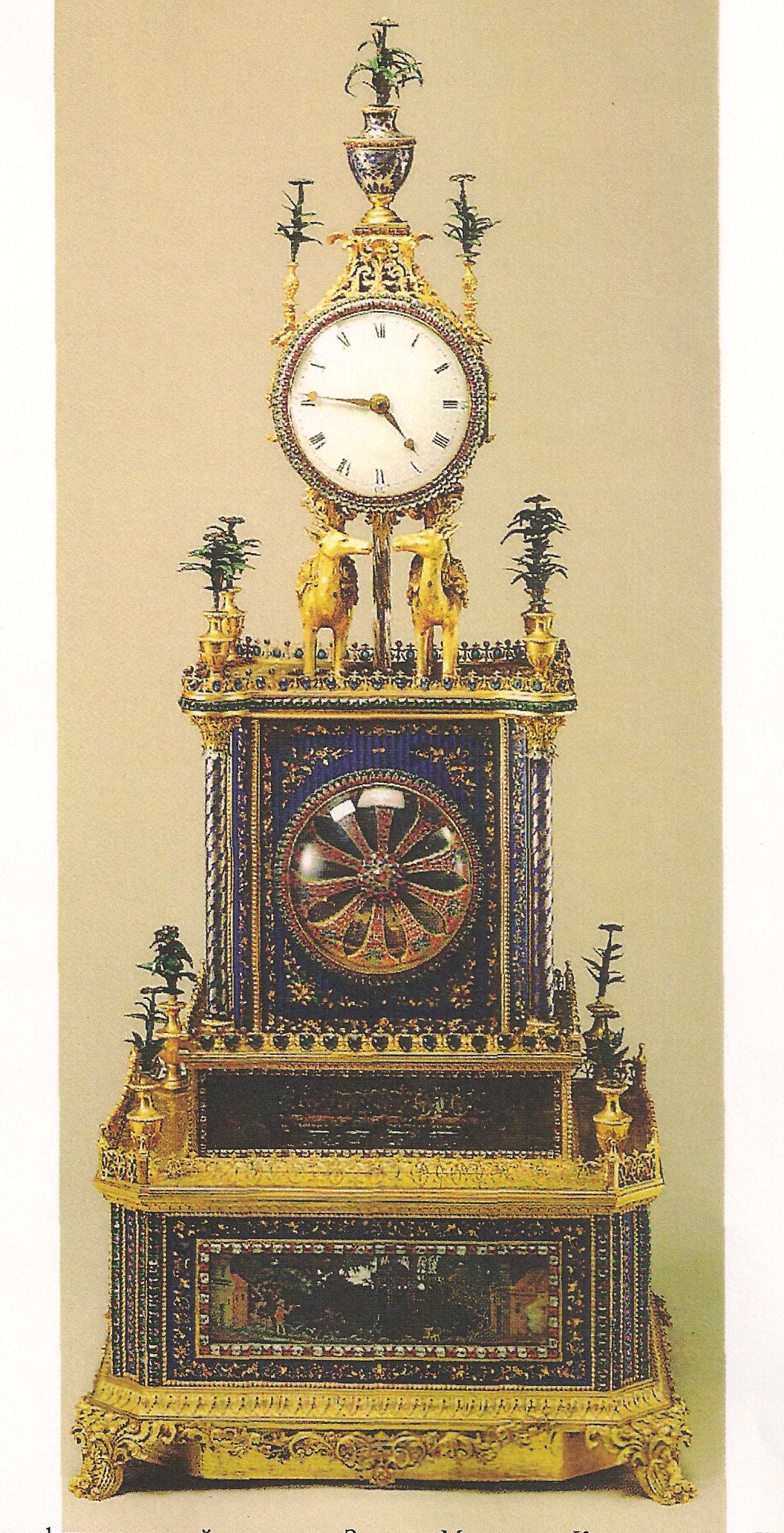Ил.258.Часы-павильон с фигурами двух ланей, поддерживающих колесо-циферблат. Бронза, стекло, эмаль, стразы, литье, гравировка, золочение, инкрустация. Мастерские Кантона/Гуанчжоу, период Цяньлун. Музей Гугун, Пекин [164, с. 64].