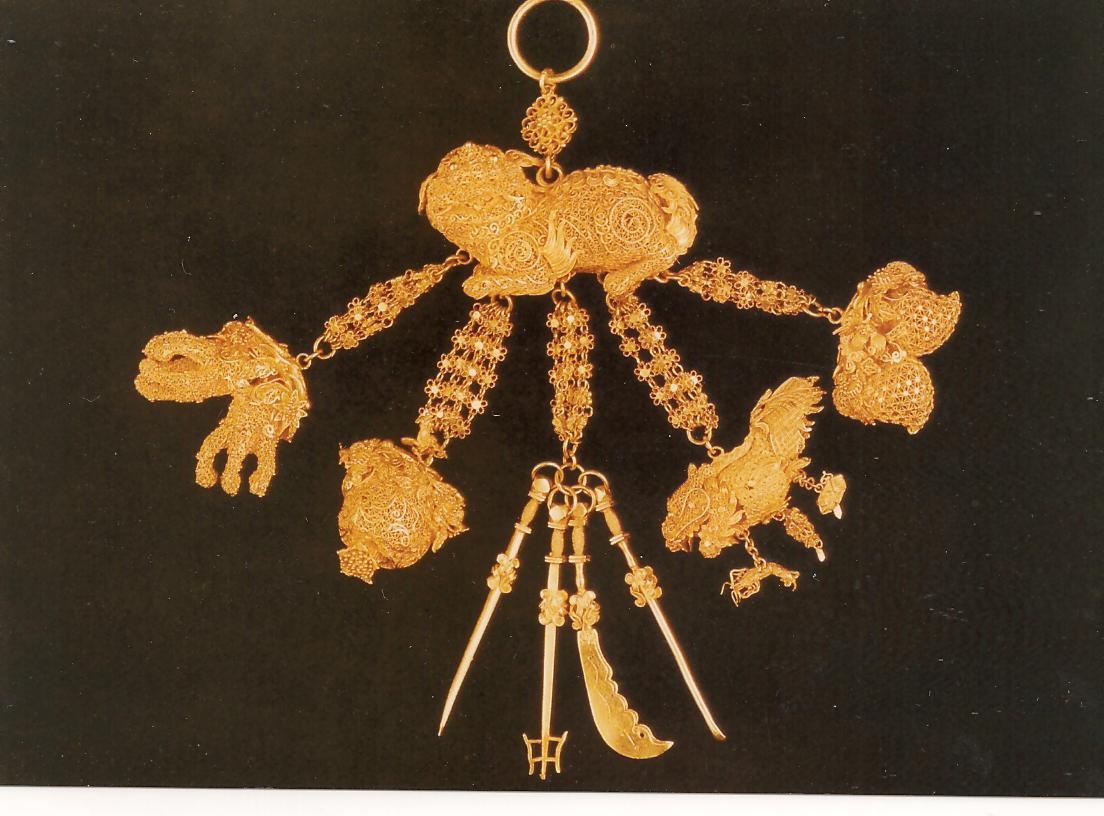 Ил.260. Шатлен с центральной подвеской в виде фигурки цилиня. Золото, филигрань. Китай, XVIII-XIX вв. [281, № 78].