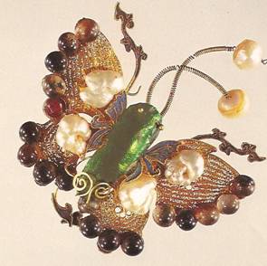 Ил.263. Навершие женской шпильки в виде бабочки. Золото, жемчуг, цветные камни огранки кабошон, эмаль, филигрань, низание, инкрустация. Китай, 1778. Музей Гугун, Пекин [166, с. 49].