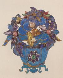 Ил.262. Навершие женской шпильки в виде кашпо с цветами. Серебро, жемчуг, стразы, перья зимородка, филигрань, золочение, низание, инкрустация, аппликация. Китай, вторая половина XIX в. Музей Гугун, Пекин [166, с. 73].