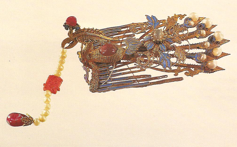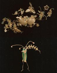 Ил.267. Парные головные украшения в виде набора предметов, представляющих собой благопожелательный ребус. Золото, филигрань, жемчуг, драгоценные камни отделки кабошон. Китай, 1776. Музей Гугун, Пекин [166, с. 81, № 162].