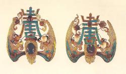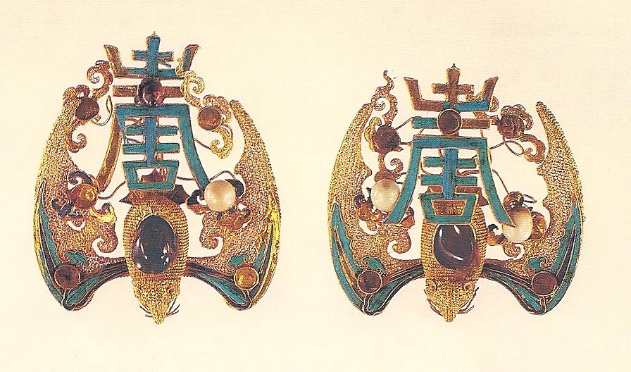 Ил.265. Парные головные украшения в виде летучих мышей и знаков шоу («долголетие»). Золото, жемчуг, цветные камни, перья зимородка, филигрань, инкрустация, аппликация. Китай, 1765. Музей Гугун, Пекин [166, с. 69].