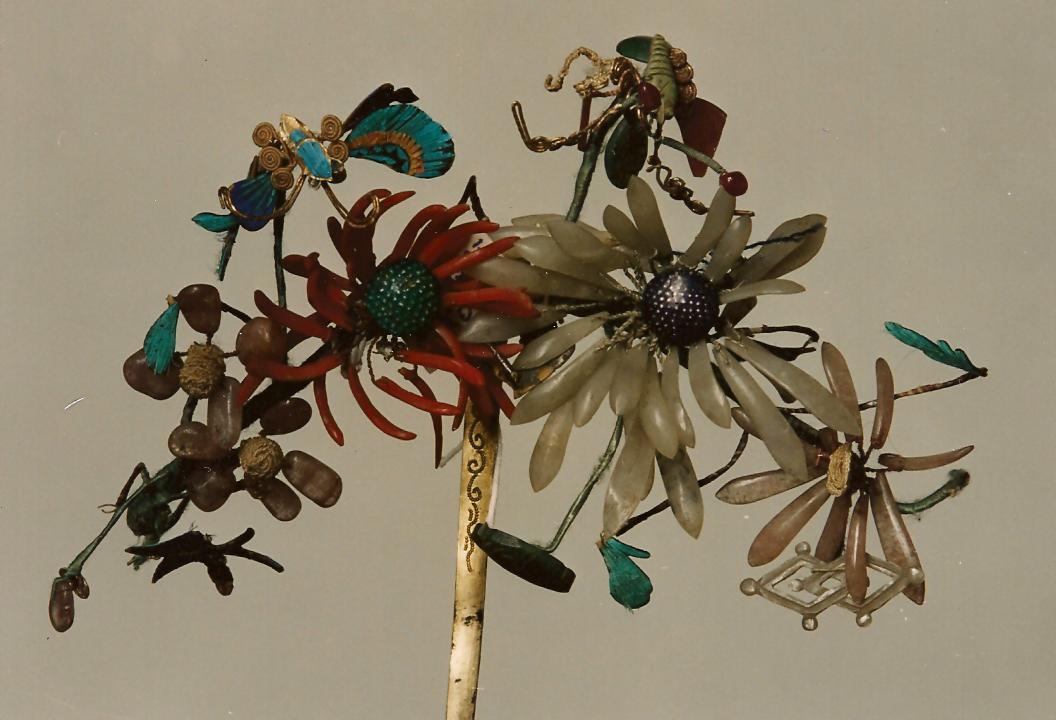 Ил.266. Шпилька (одна из пары) с декором в виде весенних и осенних цветов, бабочек и символических «драгоценностей» бабао. Золоченое серебро, цветные камни, перья зимородка, золочение, полировка, низание, аппликация. Китай, конец XVIII – начало XIX вв. ГМВ, Москва (инв. № 5226 I, 5499 I) [97, с. 208, рис. 1].