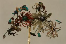 Ил.268. Украшение для женской прически (одно из комплекта) в виде веточки с плодами граната и двух бабочек. Серебро, перья зимородка, чеканка, гравировка, золочение, аппликация. Китай, конец XVIII в. ГМВ, Москва (инв. № 5492 I). [97, с. 216, рис. 1].