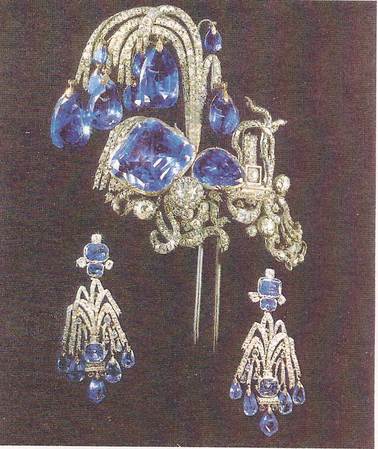 Ил.271. Комплект украшений (эгрет и пара серег-фонтанов) в стиле рококо. Золото, серебро, бриллианты, сапфиры. Россия (?), 1750-е гг. Государственный алмазный фонд, Москва [128, ил.11; Горева О. Сокровища Алмазного фонда. М., 2008, ил. 9, 10].