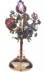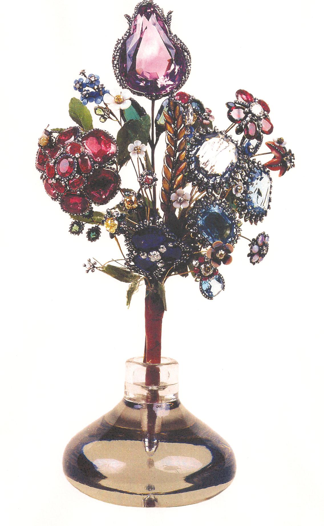 Ил.273. Цветочный букет из самоцветов с аметистовым тюльпаном. Золото, серебро, алмазы, агаты, аквамарин, аметист, бериллы, бирюза, гранаты, изумруды, кахалонг, кварц льдистый, опалы, сапфиры, тигровый глаз, голубой топаз, шпинели, часть листьев – из зеленой ткани. Россия, Санкт-Петербург, вторая половина XVIII в. ГЭ, Санкт-Петербург [78, с. 19].