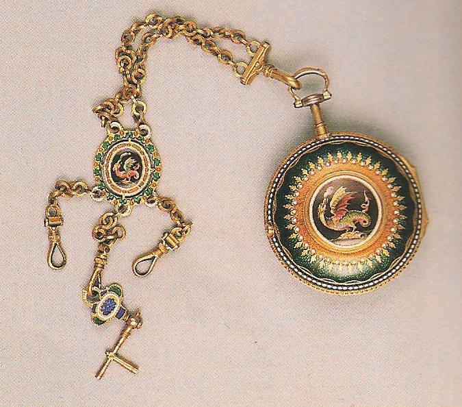 Ил.279. Часы на шатлене. Медь, эмаль, золочение. Англия, XVIII в. Музей Гугун, Пекин [164, с. 214].