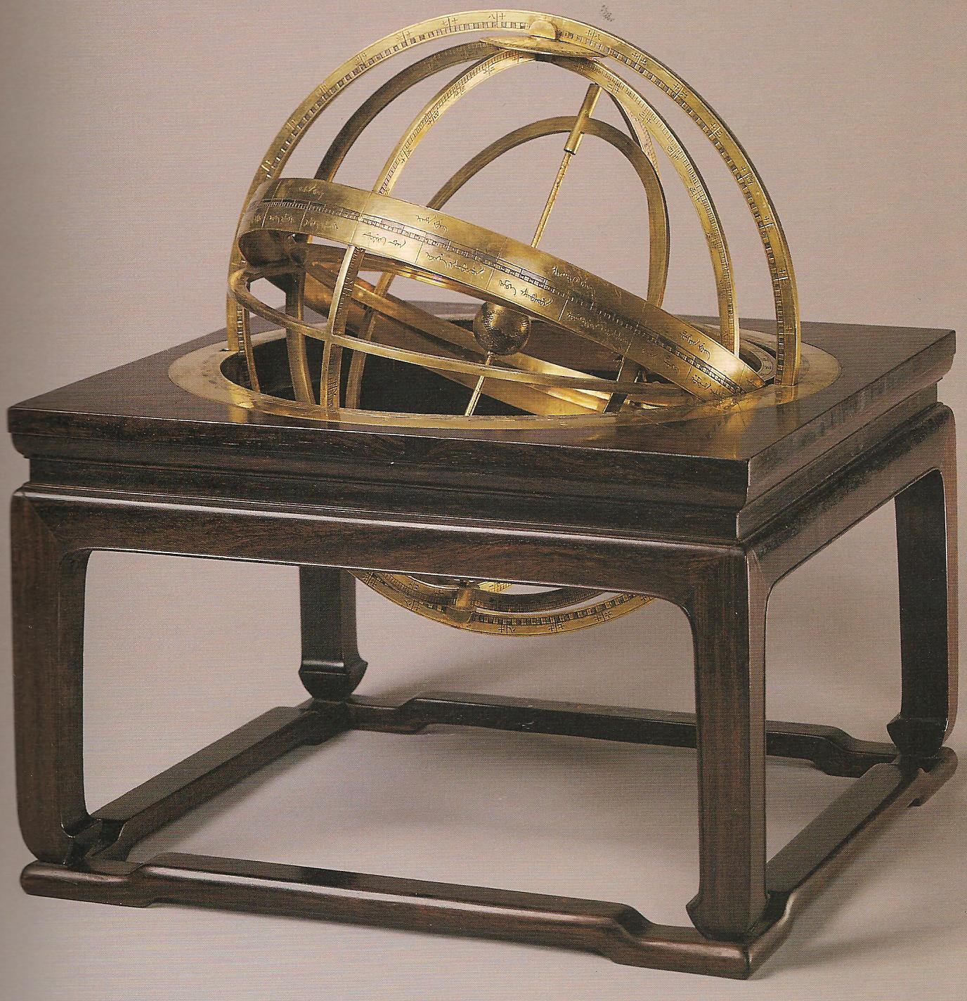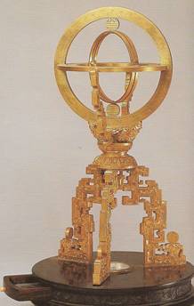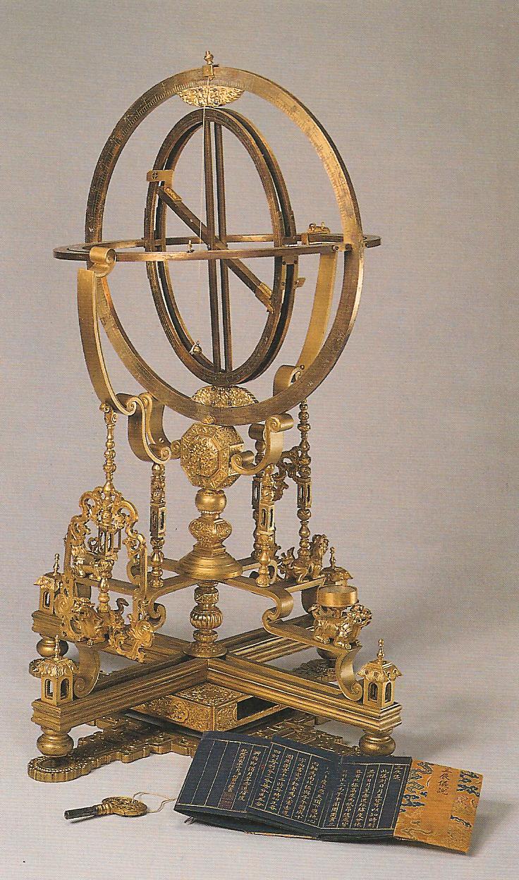 Ил.73. Слева: Армиллярная сфера с маркой Ф. Вербиста. Медный сплав, литье, гравировка, золочение. Пекинские придворные мастерские, 1669. Музей Гугун, Пекин [163, с. 8-9].