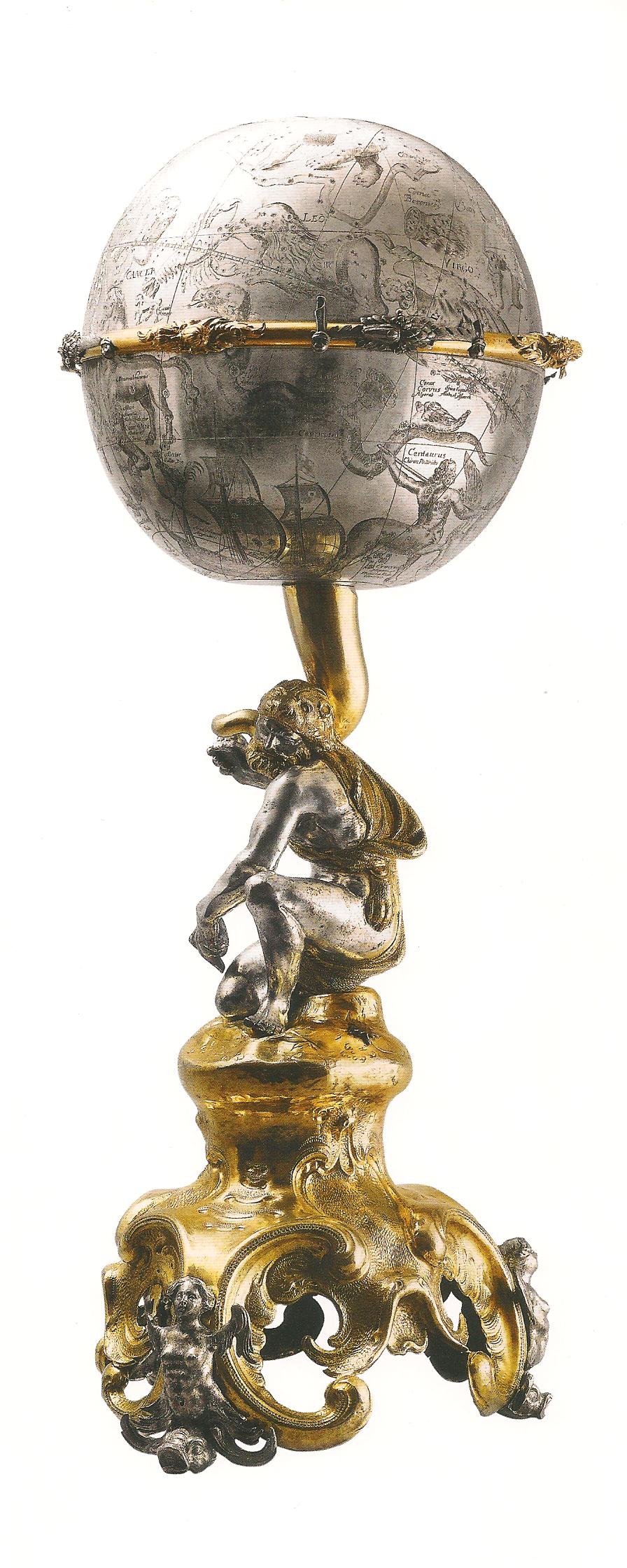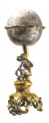 Ил.86. Настольное украшение-сосуд в виде небесного глобуса с фигурой Геракла. Серебро, литье, чеканка, гравировка, золочение Мастер Генрих II Ламбрехт. Гамбург, середина XVII в. [Шедевры немецкого серебра в Кремле (каталог выставки). М., 2002, № 99].