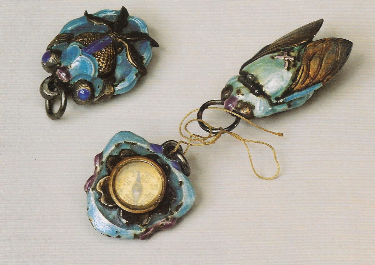Ил.88. Поясные компасы в виде рыбок и цикады. Серебро, поливная эмаль. Пекинские придворные мастерские, период Цяньлун. Музей Гугун, Пекин [163, с. 146].