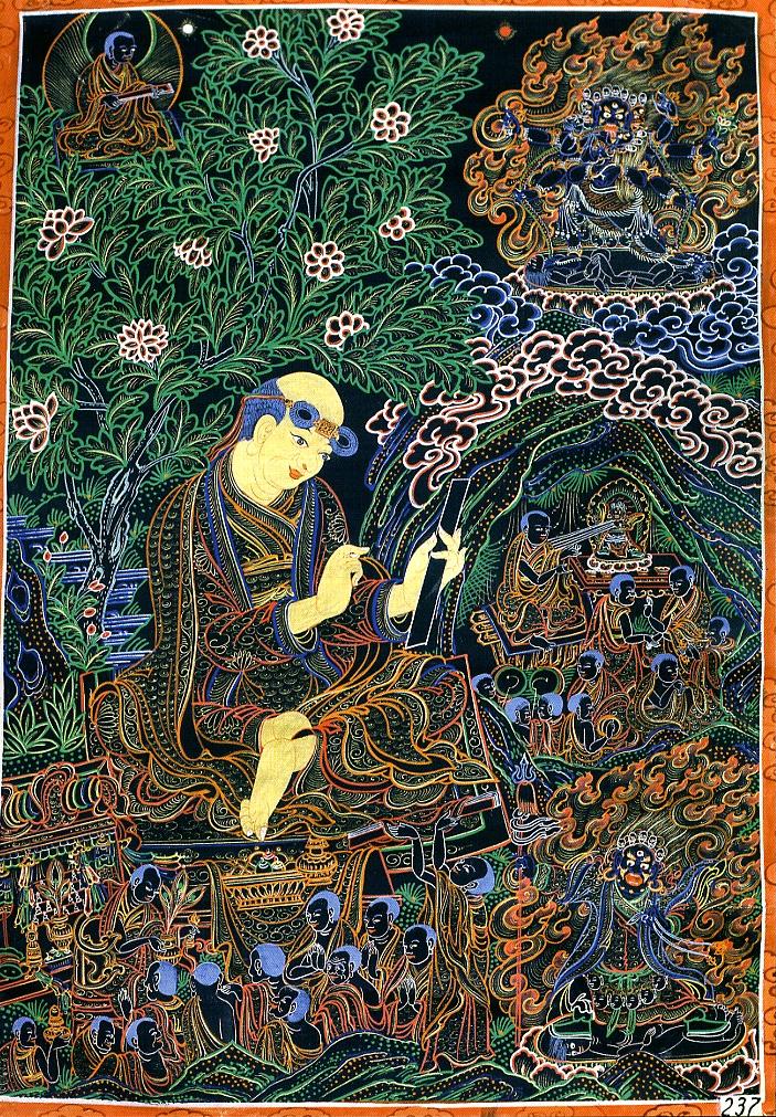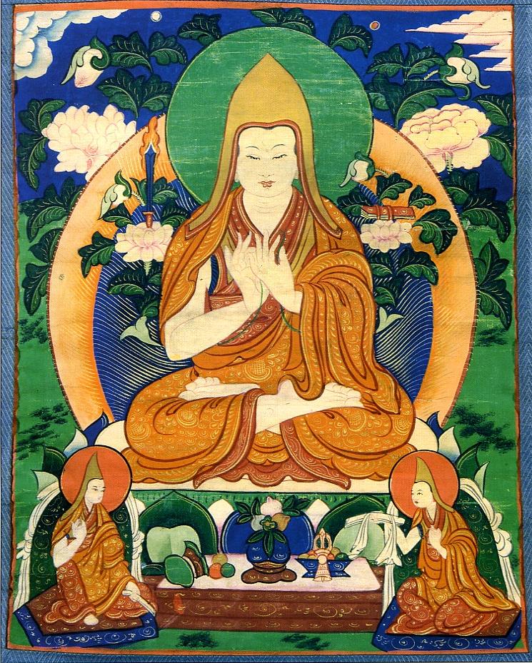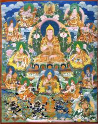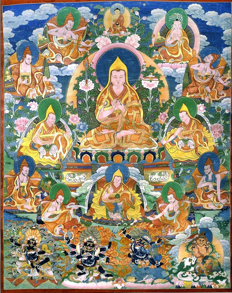 Досточтимый Цонкапа с учениками в центре иконографической группы «шесть украшений Джамбудвипы и два высших» (тиб.: ргйан друг мчхог гнийс). Нагарджуна, Арьядева, Асанга, Васубандху, Дигната, Дхармакирти и Гунапрабха и Шакьяпрабха, изображенные на танке, представляют суть воззрения школ Махаяны: мадхьямика (шунья-вада) и читта-матра (виджняна-вада). Последователи Ваджраяны разделяют взгляды шуньявадинов и виджнянавадинов о природе истинной реальности и практике духовных достижений. Вверху - Будда Шакьямуни, посередине под Цонкапой - Джанджа Лалитаваджра (1717-1786). Внизу - Вайшравана, Ямараджа, Махакала, Шридеви.