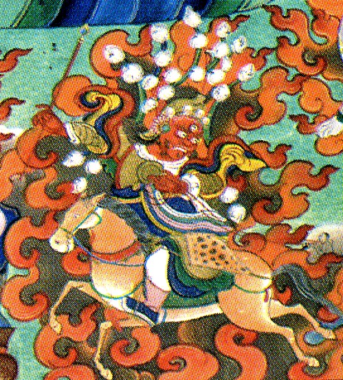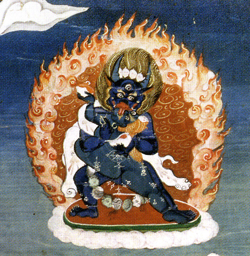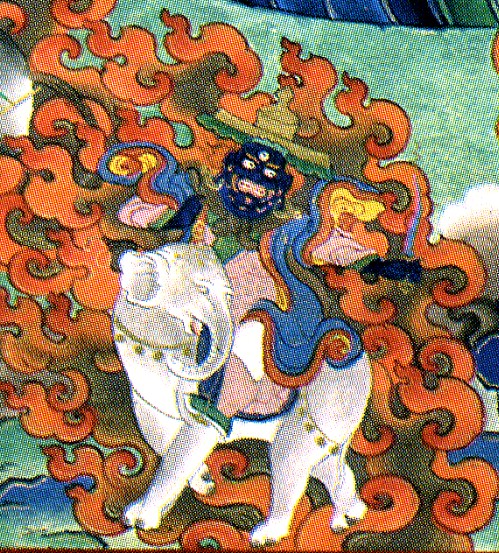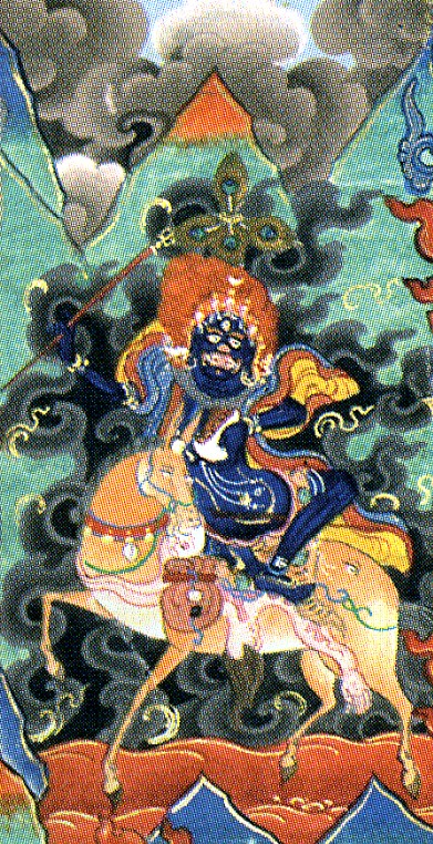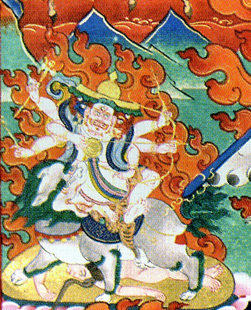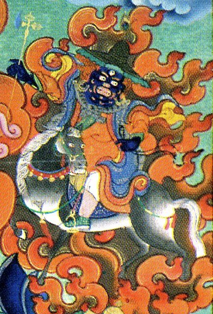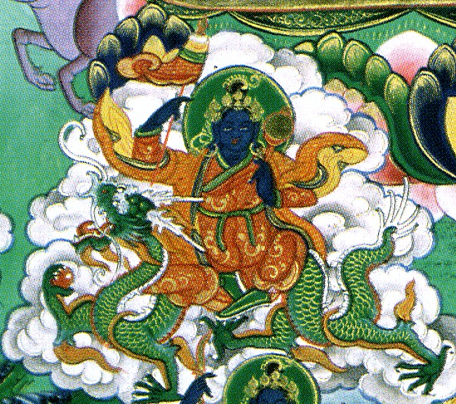 Ваджрапани в традиции иконографии ньингмы изображен в пратьялидха-асане, одноликим, двуруким. Цвет тела - темно-синий. В одеяниях и украшениях дхармапалы. Слева от волос в золотом и киноварном сиянии - птица, сверху и справа - две Гаруды со змеями в клювах, у центрального Гаруды в руках - боевые дискообразные ножи (скр. чакра). Слева от солнечного диска, на котором стоит Ваджрапани, - змея и дикий кабан, справа - змея и девять диких кабанов. На груди киноварно-золотой круг с фигуркой гуру Падмасамбхавы, что маркирует семейство представляемой формы проявления Ваджрапани. Вверху - гуру Падмасамбхава, вокруг - четыре локапалы, двенадцать тенма или богинь-охранительниц Тибета: Палден Хари Дордже Ямакьонг, Юий Дрильбу Дордже Зулема, Конгцун Дема Боикамкьонг, Менцун Ченмо Дордже Ямакьонг, Ценла Ларо Дордже Менчигма, Серчен Кхадинг Дордже Лангмоче, Дрогчен Кхордул Дордже Гег-кий-цо, Дагний Ченмо Дордже Кундрагма, Канг кий Юмчен Дордже Кунтудраг, Мари Рабджам Дордже Драгмо Гьял, Гангкар Шамей Дордже Юбхунма, Кхараг Кхьунгцун Дордже Пел-гьи-юм. Жертвенное подношение состоит из вещество обета. Ландшафтный фон составлен из облаков, холмов и водоемов.