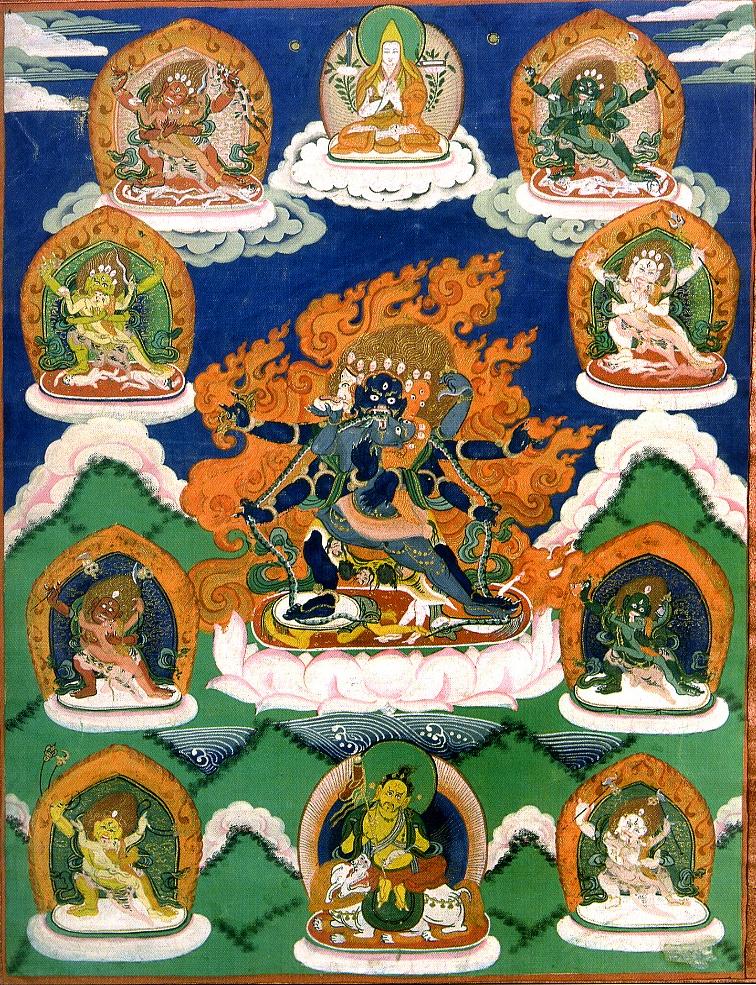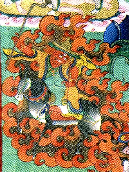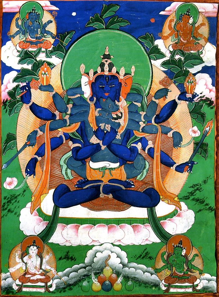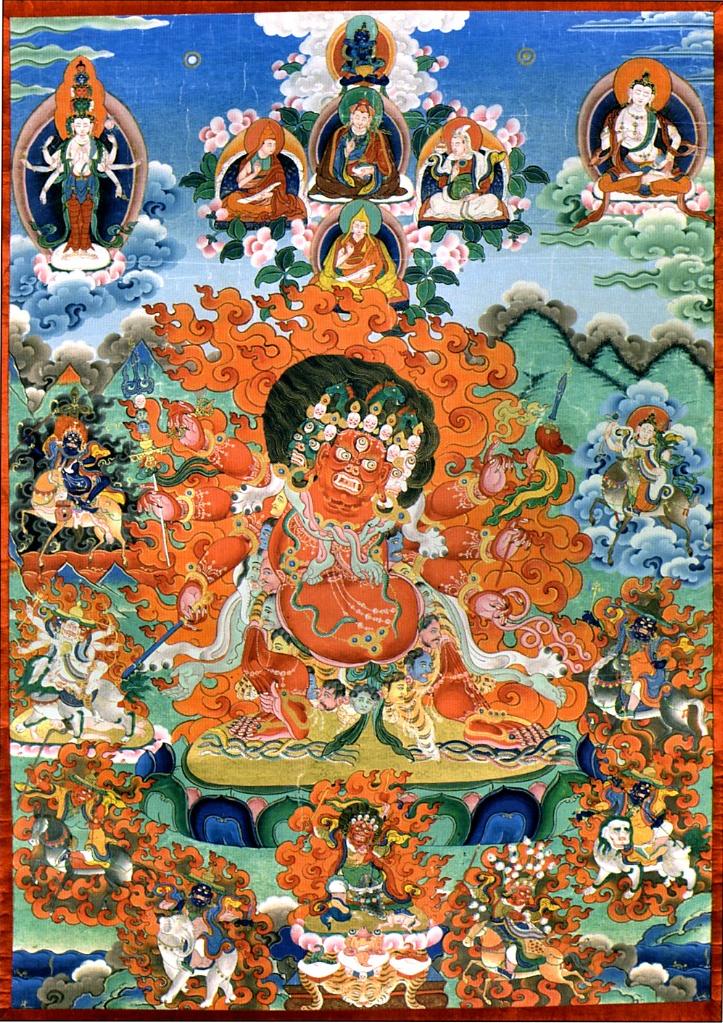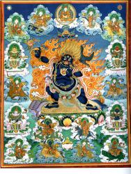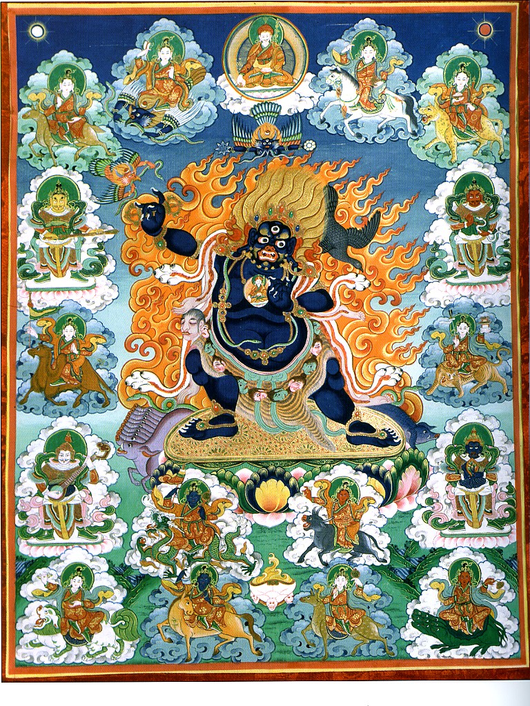 Йидам Махачакра Ваджрапани в коружении божеств мандалы. Вверху - Дже Цонкапа. Внизу в центре - Махасуварна Вайшравана. Не изображено жертвенное подношение. Ландшафтный фон составлен из разноцветных облаков, зеленых гор и водоемов.