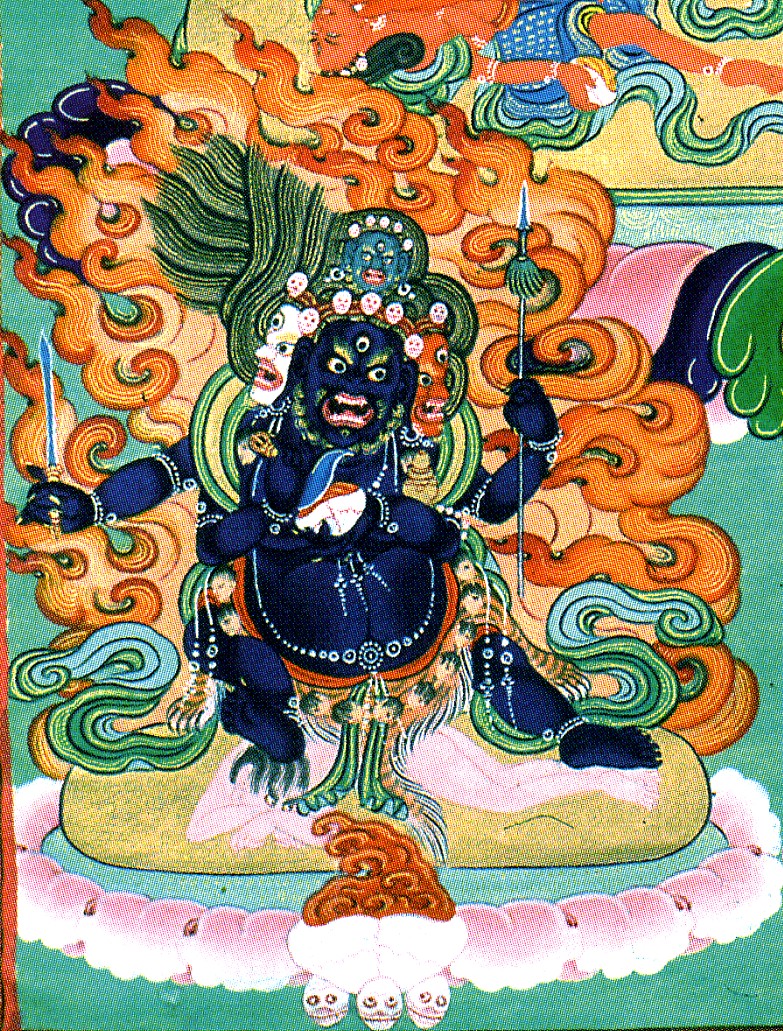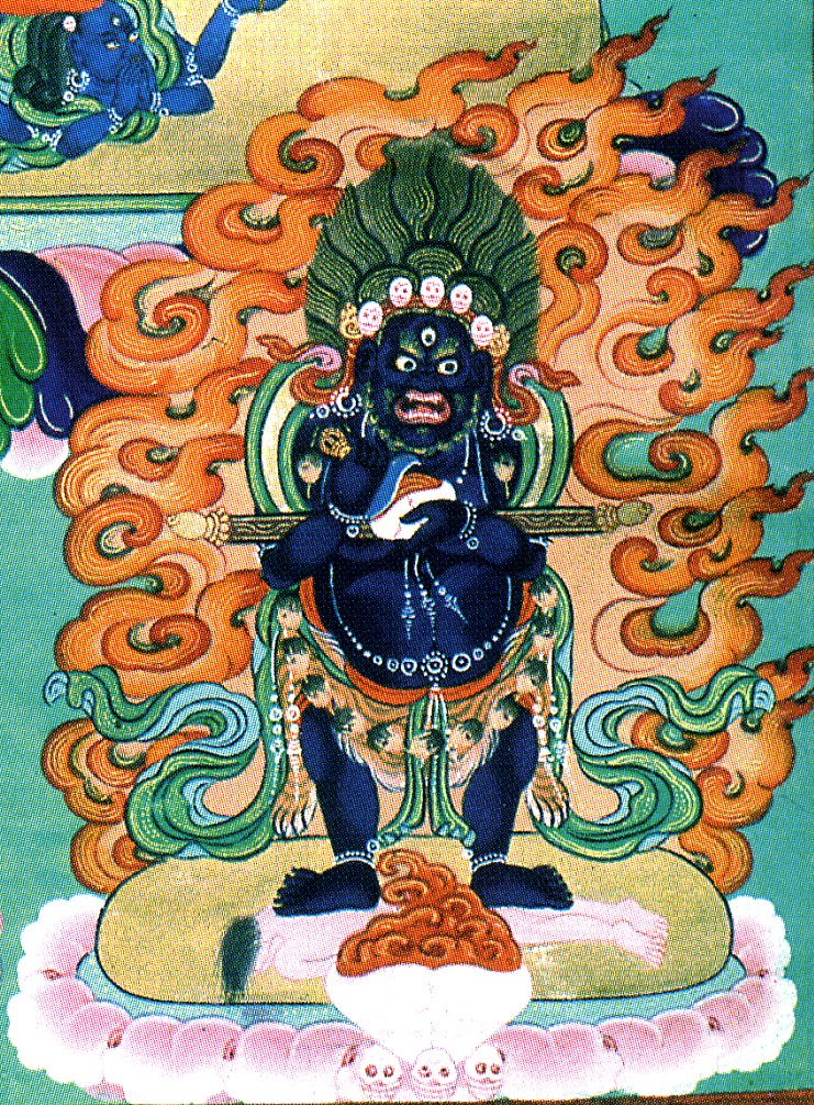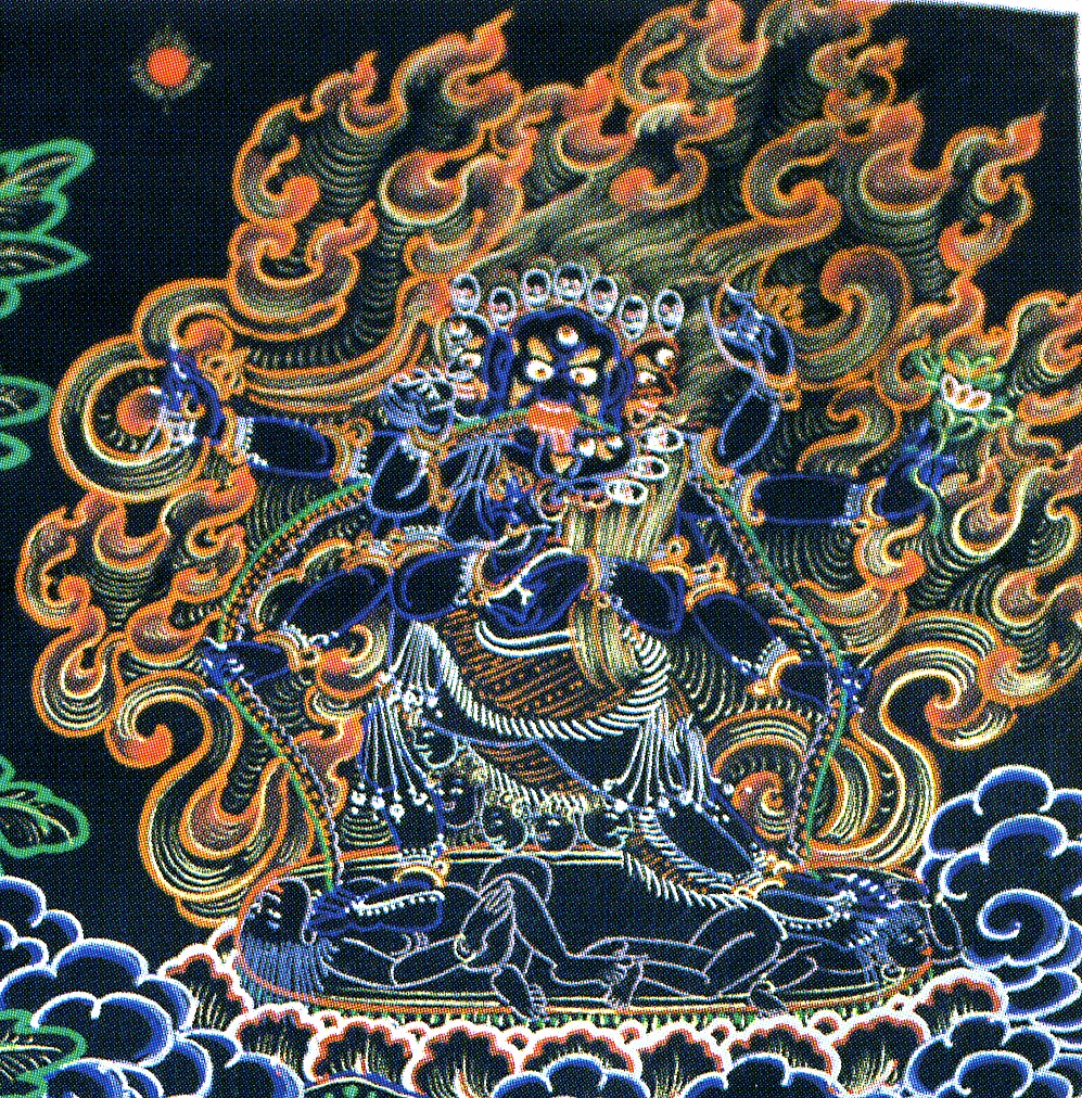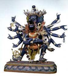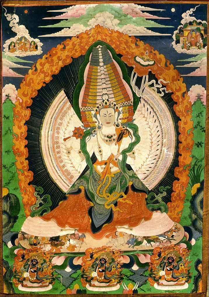 Йидам Махачакра Ваджрапани в коружении божеств мандалы. Вверху - Дже Цонкапа. Внизу в центре - Махасуварна Вайшравана. Не изображено жертвенное подношение. Ландшафтный фон составлен из разноцветных облаков, зеленых гор и водоемов.