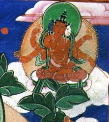 Восемнадцатирукий (аштадаша-бхуджа) Падманарта-ишвара (Падманартешвара) - йидам Крия-тантры (?). Относится к семейству Падмы, как воплощение Авалокитешвары. Аштадаша-бхуджа Падманатра-ишвара представлен в ваджра-асане, одноликим, трехглазым, восемнадцатируким, две главные руки выполняют жест Вайрочаны (?), в остальных руках различные атрибуты: кувшин с водой, чакра, аркан, ваза, лотос, штандарт, ритуальный кинжал, топорик, четки, плод (?), меч, на ладони правой семнадцатой руки глаз; четыре атрибута не поддаются идентификации. (Руки считаются снизу вверх с каждой стороны. - прим. Адм.) На диадеме - Амитабха. Цвет тела - золотой. В одеяниях и украшениях царевича.