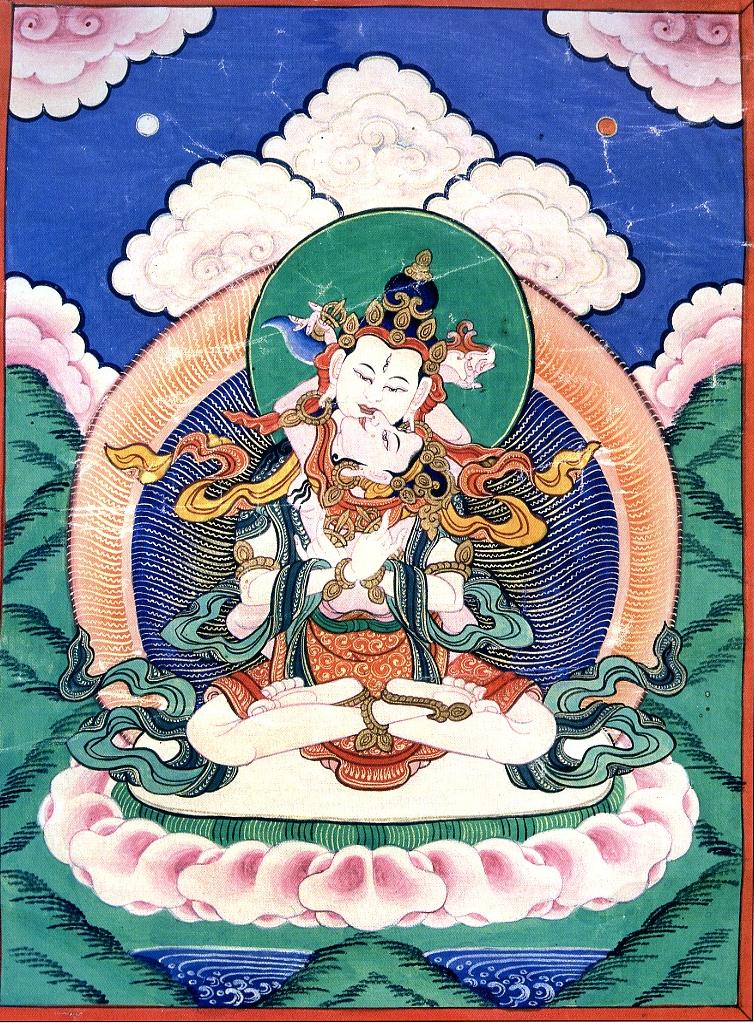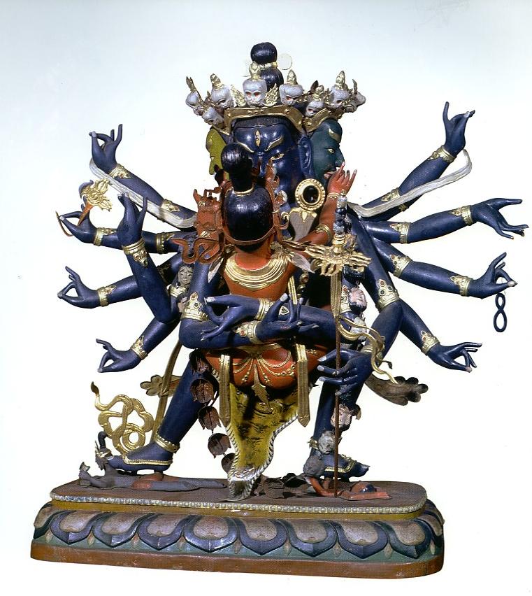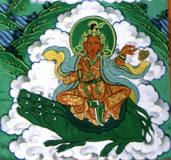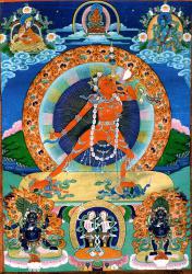 Ваджрайогини - йидам и дакини. Относится к семейству Ваджры или Татхагаты. Другое имя - Бхаттарика Ваджрайогини Нади-дакини. Дакини Ваджрайогини изображена с правой выпрямленной ногой, одноликой, трехглазой, пьющей кровь из капалы, в левой руке с кхатвангой, в правой вытянутой руке - картарика. Цвет тела - красный. Стоит левой ногой на синем Бхайраве, правой ногой - на красной Каларатри. Вверху - Ваджрадхара красного цвета. Вокруг - махасиддха Луипа, Панджара Махакала, Читипати, чатурбхуджа Шри Махакала, лама Намкха Гьялцен (?). Жертвенное подношение состоит из капалы с кровью, драгоценных и благословленных предметов. Ландшафтный фон составлен из облаков, холмов и острова, окруженного лазуритово-синими водами.