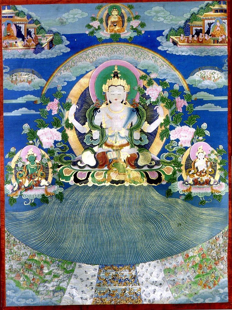 Шадакшара Авалокитешвара изображен в ваджра-асане, одноликим, четырехруким. Две главные руки сложены в жесте держания драгоценности-чинтамани (скр. мани-дхара-мудра). В одежде и украшениях царевича. Через левое плечо перекинута перевязь из шкуры черной антилопы (скр. кришна-саранги). Цвет тела - белый. Драгоценность-чинтамани в руках Шадакшары Авалокитешвары излучает ослепительно струящиеся золотые лучи, освещающие шесть сфер пребывания существ. Мандорла обрамлена пышными цветами лотоса. Над вержней частью фигуры - радужная полусфера, заполненная переливающимся многоцветием воплощения Шадакшары Авалокитешвары. Вверху Будда Шакьямуни в короне, будда Амитабха, лама-поучающий. По сторонам от центральной фигуры - Пуджа-деви в радужных полусферах на облаках. Слева и справа от лотосового сидения - Сита Тара и Шьяма Тара. Танка иллюстрирует символику шести слогов мантры Авалокитешвары: «ОМ-МА-НИ-ПАД-МЕ-ХУМ!», произносимой и созерцаемой «ради блага и конечного освобождения шести видов живых существ», которые обитают в сфере страстей (кама-дхату) сансары. На танке шесть сфер существования изображены в следующем порядке слева направо: полубоги (асура), люди, ненасытные духи (прета), твари ада (нарака - холодные и горячие), животные, божества.