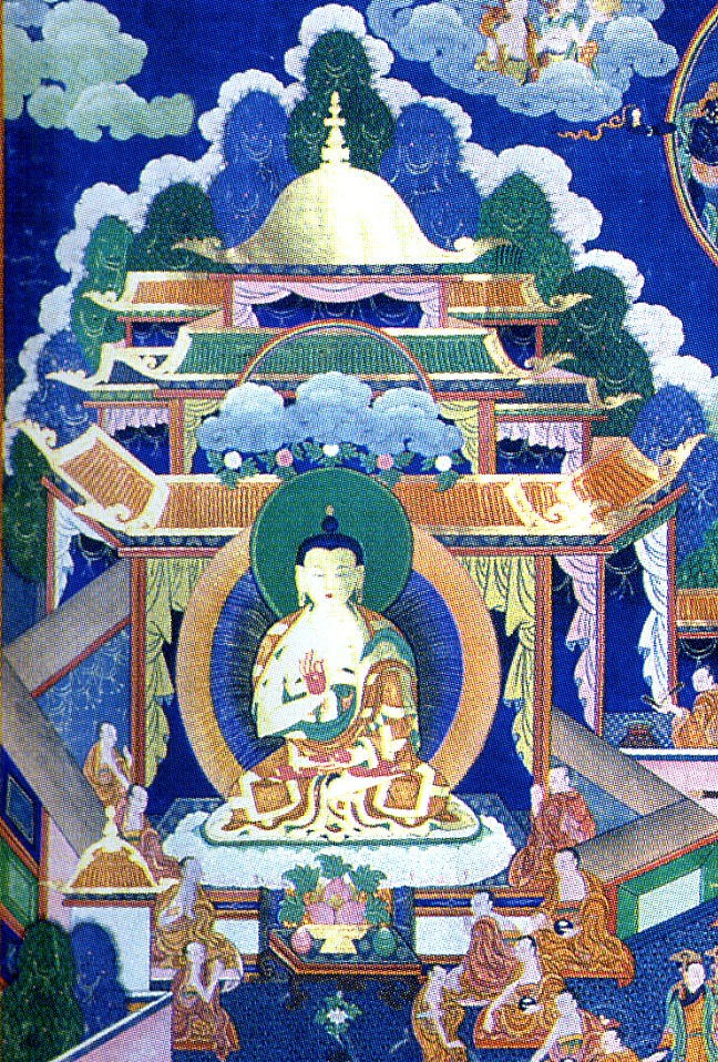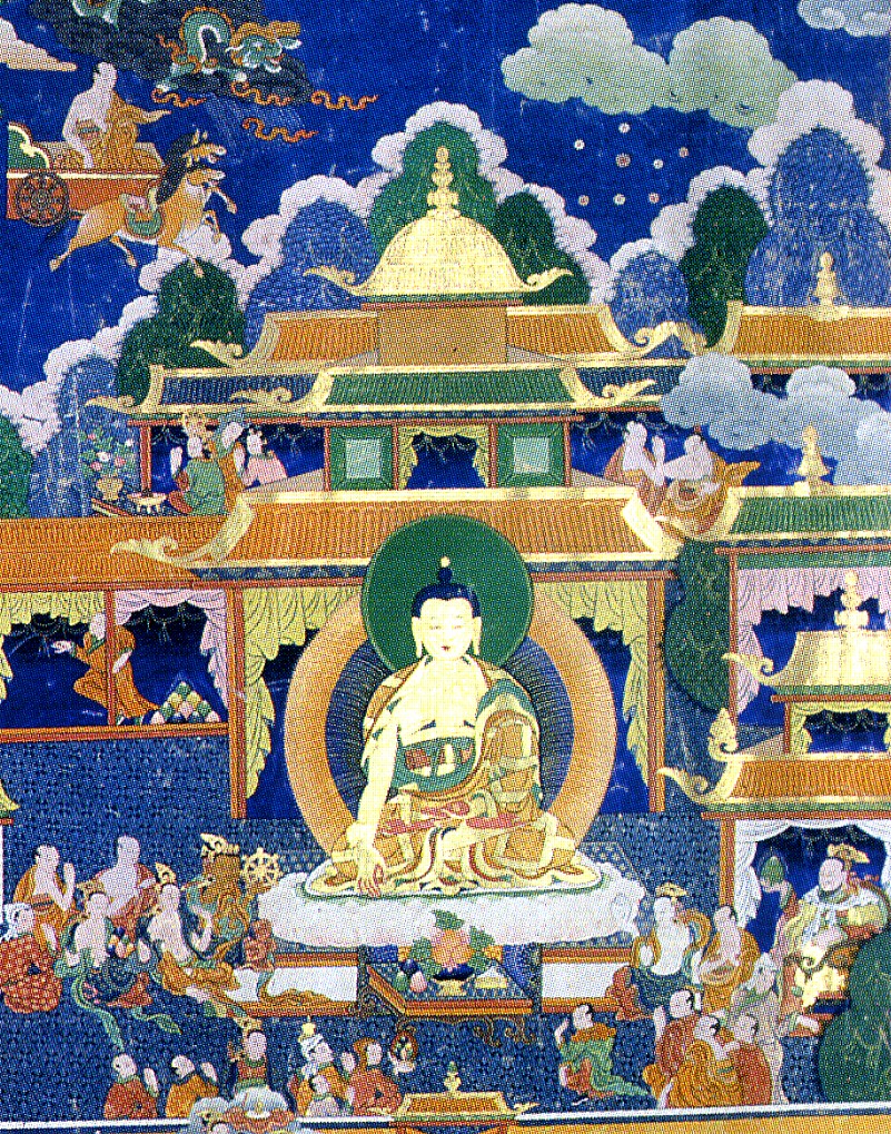 Будда Шакьямуни изображен в ваджра-асане, руки - в дхарма-чакра-правартана-мудре. Вокруг - божества, монахи, донаторы. Внизу - чудесно возникший пруд с цветами лотоса, драгоценностями-мани, веткой коралла, с миниатюрным золотым храмом и фигуркой Будды (?) на пышном цветке лотоса (?). Ландшафтный фон составлен из облаков, холмов, скал, деревьев и водоемов с введением стаффажного элемента в виде дворца с золотой и зеленой крышей.