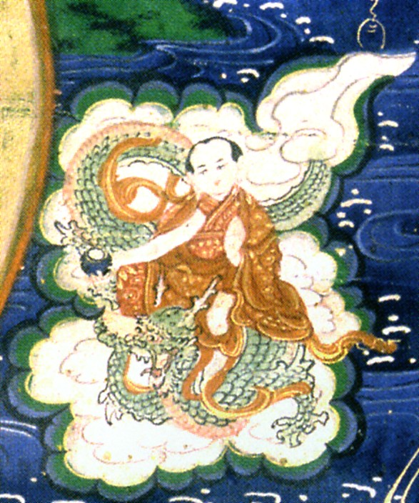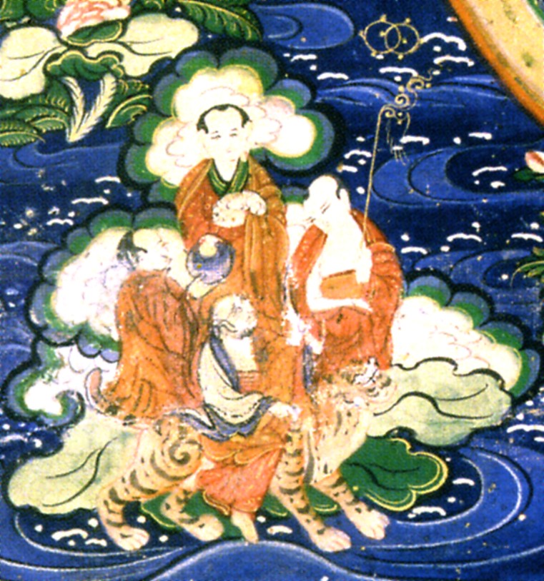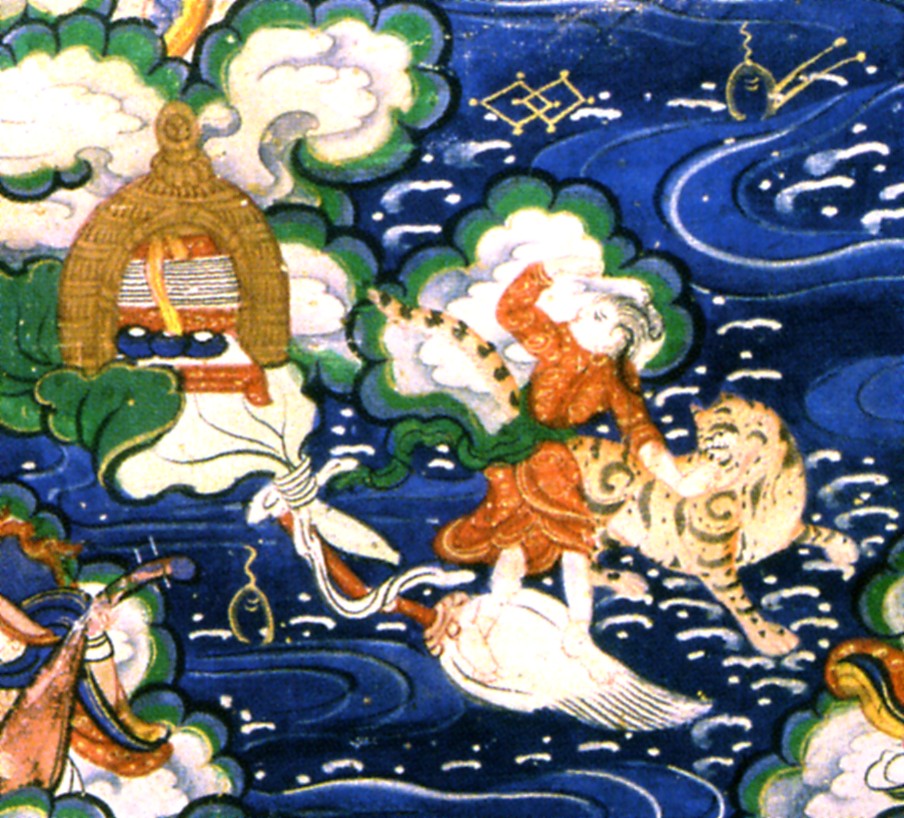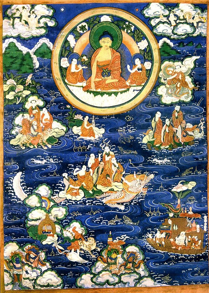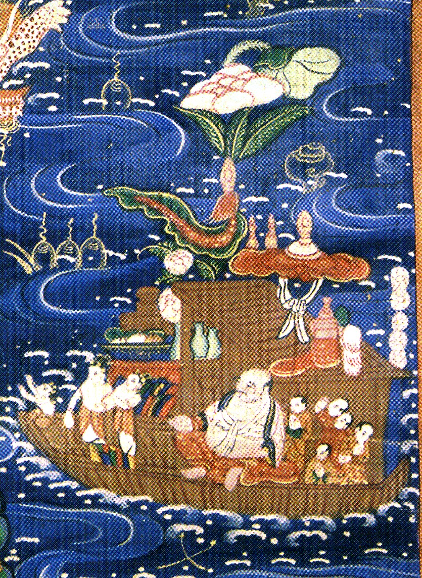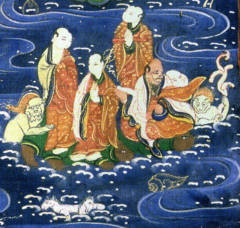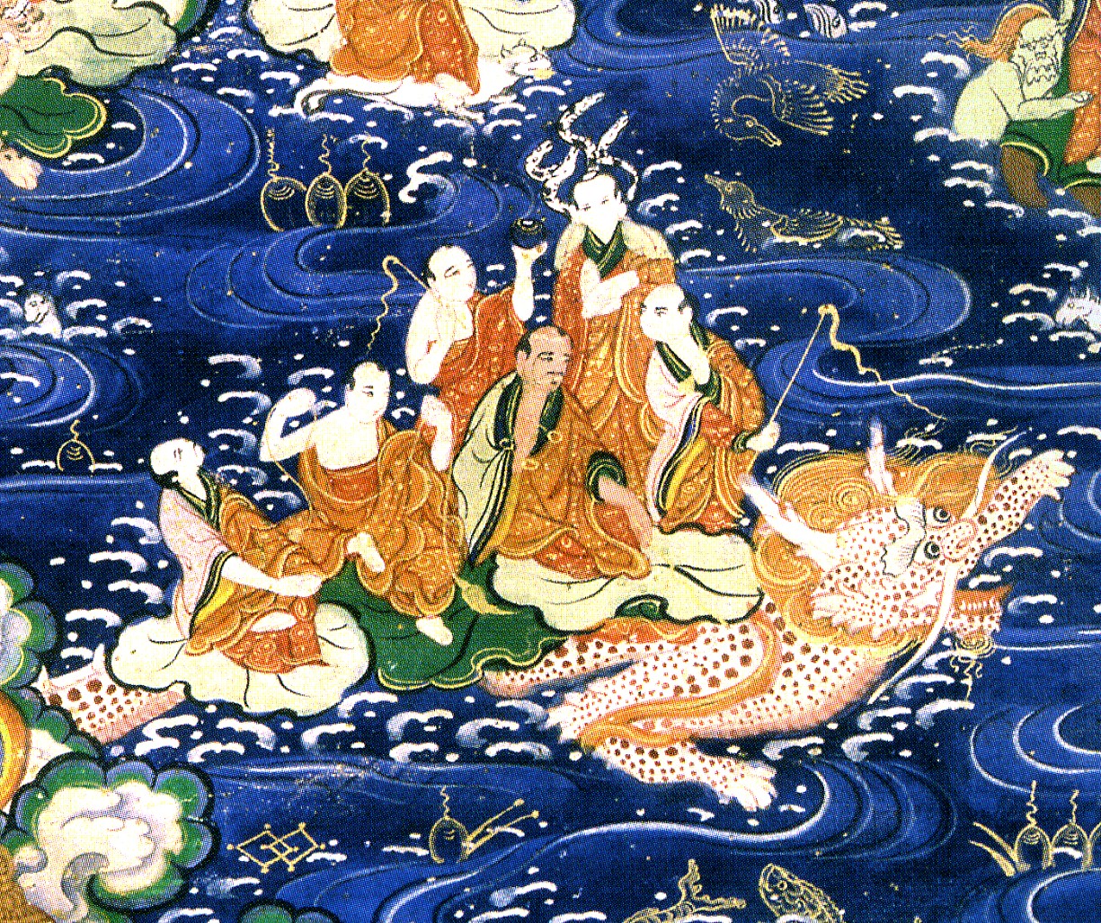 Архаты переплывают море на различных ездовых животных, морских чудовищах, облаках, невиданных размеров листьях лотоса и т.д.