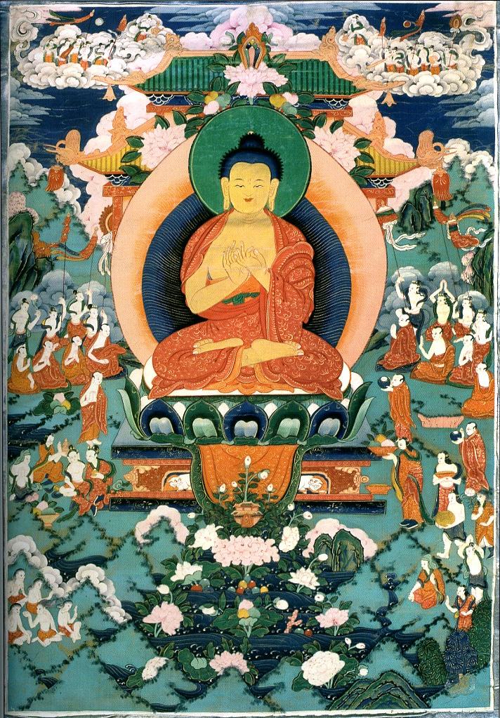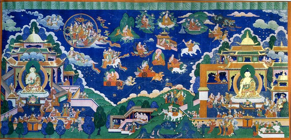 Вверху в сияющем радужным огнем круге - Будда Шакьямуни в окружении восьми бодхисаттв. Центр изображения в верхней части заполнен фигурами архатов, летящих по небу на различных ездовых животных, на своих сидениях, оседлав холмы, цветущие рощи, справа - Индра со свитой на слоне Айравата, повсюду - Будда в окружении бодхисаттв, йогинов, донаторов. Сверху композиция обрамлена шелковой драпировкой зеленого цвета. Ландшафтный фон составлен из облаков, холмов, скал, деревьев и водоемов. Танки горизонтальной формы появились под китайским влиянием и встречаются довольно редко.