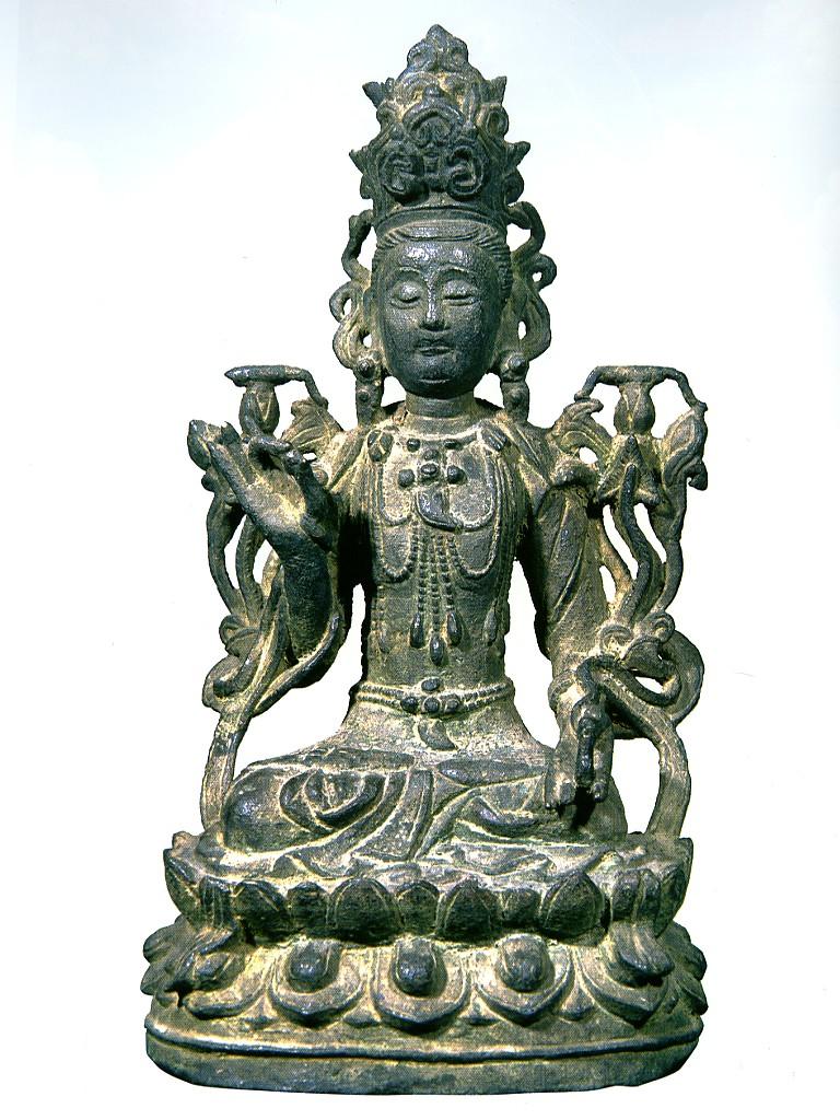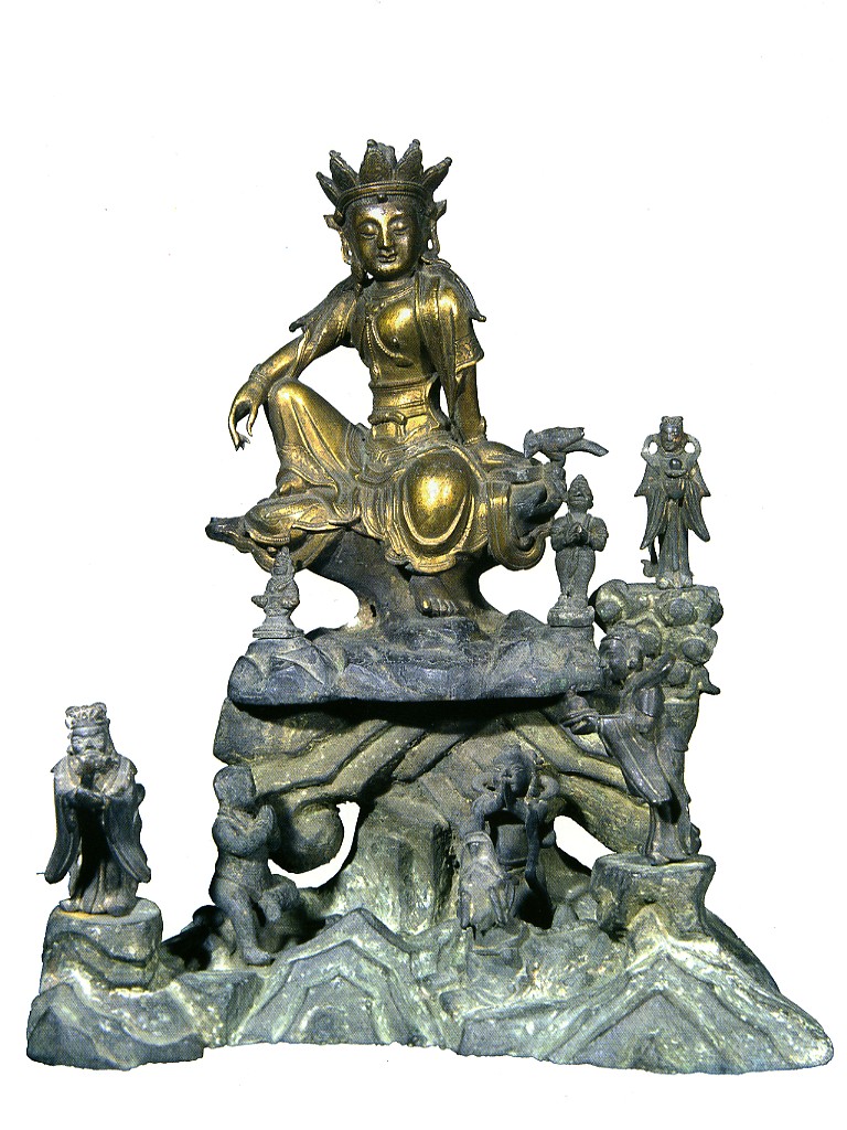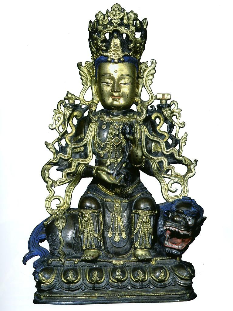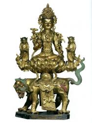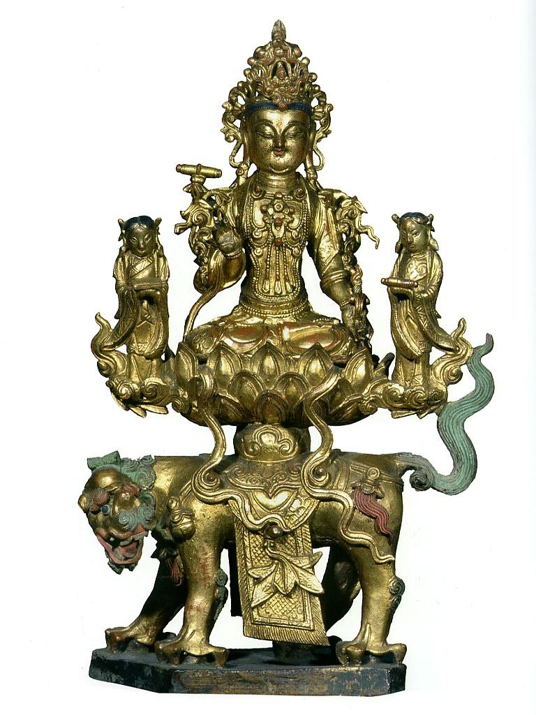 Бодхисаттва Гуаньинь представлена в бхадра-асане, в руках - стебель с бутоном лотоса. В одеяниях и украшениях Самбхога-кайи. По обеим сторонам на уровне плеч слева - книга, справа - раковина (?). Митрообразная корона украшена фигуркой татхагаты Амитабхи. Ездовое животное - полулежащий лев с оскаленной пастью, на лотосе.