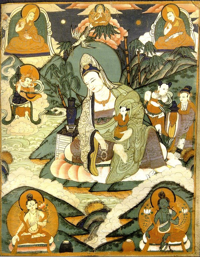 Гуаньинь - бодхисаттва-махасаттва Махаяны, воплощение Авалокитешвары в женском облике, как «Отец-и-мать всех будд». Гуаньинь изображена в свободной позе, одноликой, двурукой, в левой руке ребенок, в правой - четки. В шелковом одеянии и драгоценных украшениях, на голове - кружевная накидка. Восседает на лунном диске и светло-розовом лотосе. Справа от лотосового сидения - кувшин с веткой ивы, книга «Праджня-парамиты», сверху - голубь с нитью золотых бусин (?) в клюве - символ плодородия. Слева - поклоняющиеся, справа - дварапала Вэйто (?). Вверху - Дже Цонкапа с учениками, внизу - Шьяма Тара, Сита Тара. На переднем плане - две драгоценности-мани. Ландшафтный фон составлен из разноцветных (в «тибетском» стиле), блекло-бежевых (в «китайском» стиле) облаков, гор, слоистых холмов, берега моря, бамбуковой рощи. Композиция с Гуаньинь соответствует распространенному в китайской иконографии типу изображений Гуаньинь-чадоподательницы.