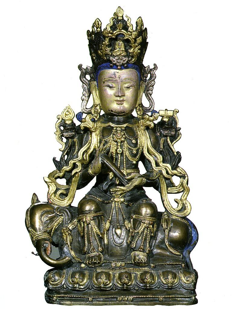 Бодхисаттва Пусянь (скр. Самантабхадра) представлен в бхадра-асане, в руках - книга. В одеяниях и украшениях царевича. По обеим сторонам на уровне плеч слева - книга, справа - жемчужина в золотом ореоле. Митрообразная корона украшена фигуркой татхагаты Амитабхи. Ездовое животное - полулежащий слон на лотосе.