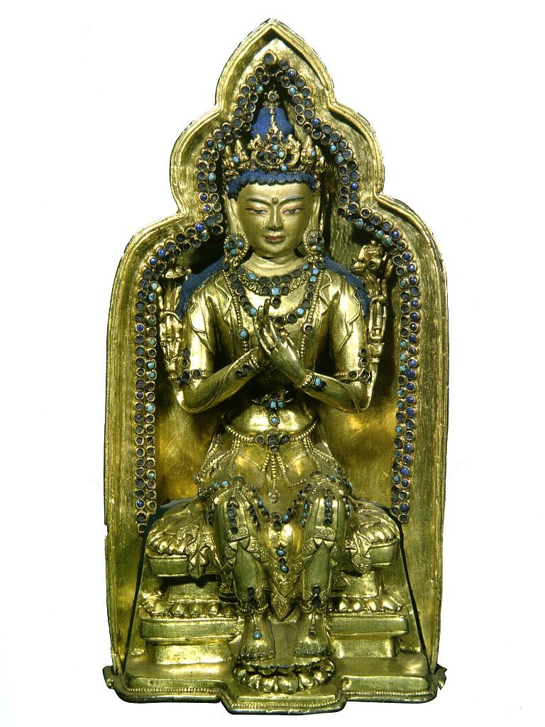 Майтрея - бодхисаттва-махасаттва, седьмой в махаянской группе восьми великих бодхисаттв, относится к семейству Кармы (кула-иша - Амогхасиддхи) и считается буддой будущего мирового периода. Возможный вариант - воплощение Ваджрадхары. Майтрея представлен в бхадра-асане, символизирующей его приход в «Благой период времени» (скр. бхадра-кальпа), руки - в дхарма-чакра-правартане-мудре. В одеяниях и украшениях царевича. По обеим сторонам на уровне плеч - лотосы. Фигура Майтреи размещена в позолоченном киоте с фестончатым завершением.