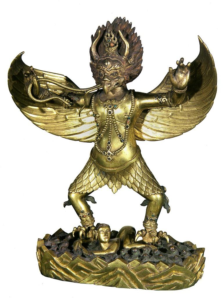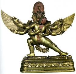 Гаруда - йидам - относится к семейству Ваджры (?) или Ратны. Покровитель буддийского учения. Йидам Гаруда представлен в позе равно согнутых конечностей (скр. самабханга), с одной головой, тремя глазами, в правой руке держит извивающуюся змею и кусает ее клювом. На голове волосы, стоящие дыбом, уши и рога быка, между рогами - тройная драгоценность, ноздри быка, клюв орла. За руками - крылья орла. Цвет тела - золотой. Украшен драгоценностями. Нижними конечностями попирает антропоморфную фигуру, лежащую на волнообразной поверхности, окруженной горами.